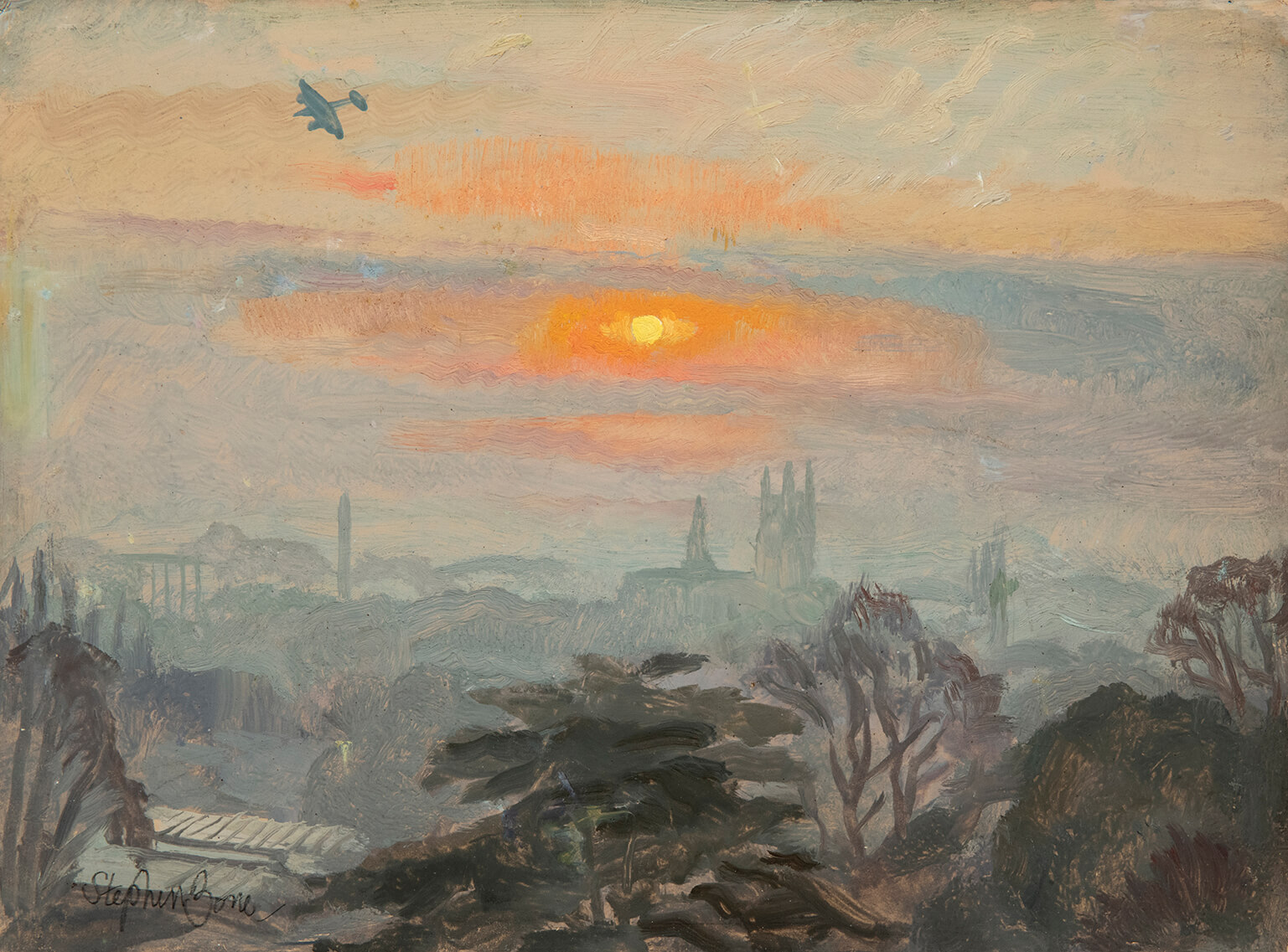 After the War, Bone found his style of painting somewhat out of fashion and, although he continued to paint, he found it difficult to get his work exhibited. He became an art critic for the Manchester Guardian, wrote humorous pieces for the Glasgow Herald and did television and radio work for the BBC. With his wife, he wrote and illustrated children’s books. He died of cancer on 15 September 1958 at St Bartholomew’s Hospital, London.